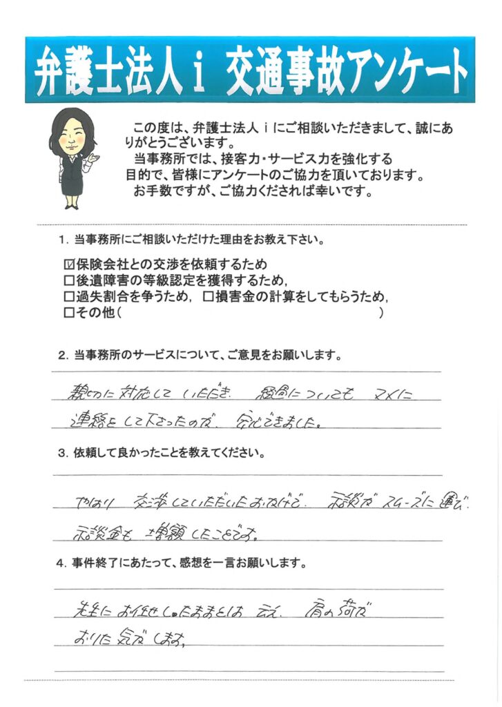 やはり交渉していただいたおかげで、示談がスムーズに運び、示談金も増額したことです。