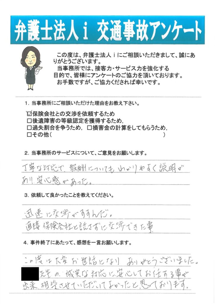 先生の、誠実な対応に安心してお任せする事が出来、相談させていただいてよかったと思っております。