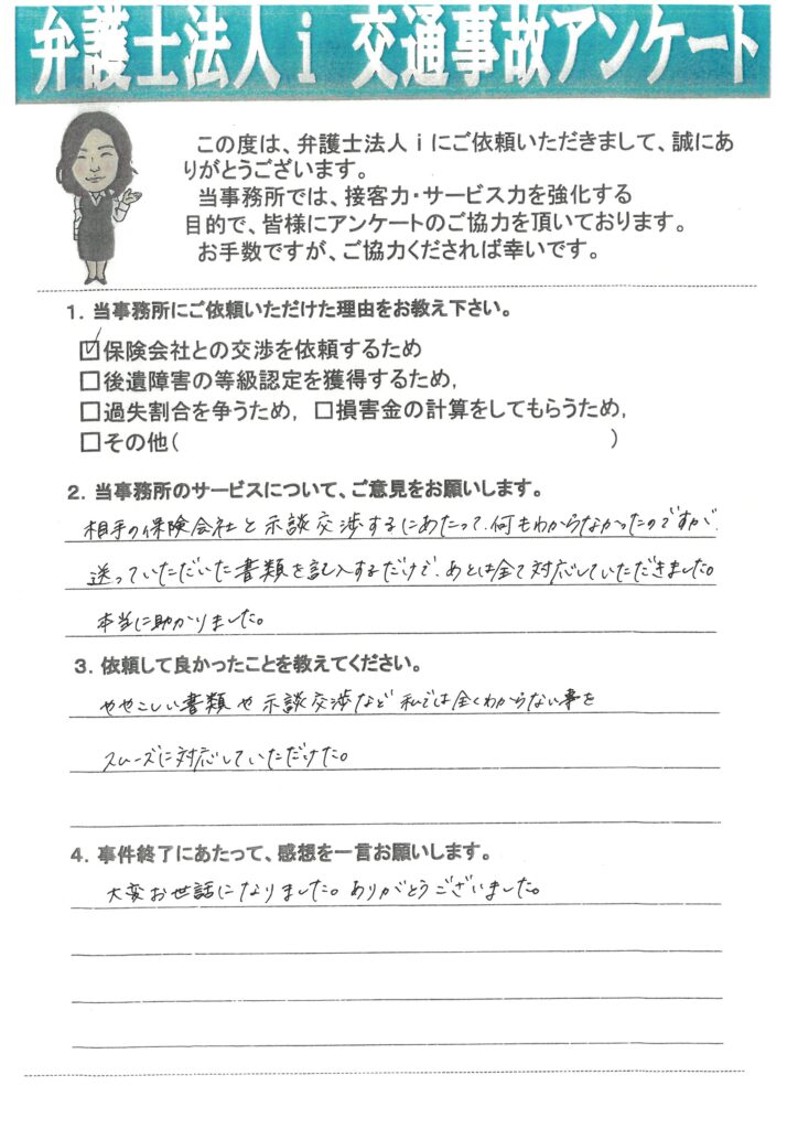 相手の保険会社と示談交渉するにあたって、何もわからなかったのですが、送っていただいた書類を記入するだけで、あとは全て対応いただきました。